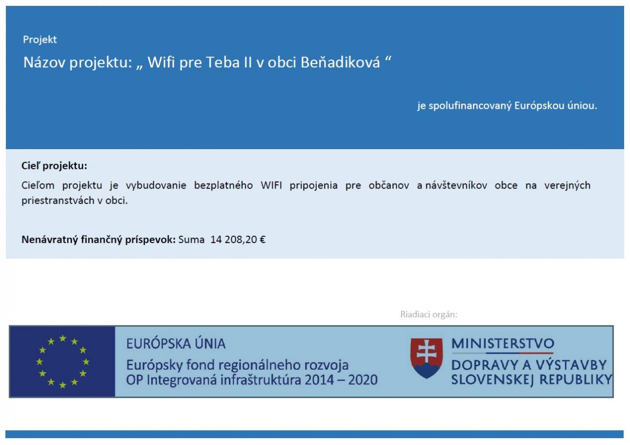 Projekt Wifi pre teba II v Obci Beňadiková súvisí s vybudovaním WiFi prístupovéhých bodov na verejných priestranstvách, ktoré poskytne bezplatné pripojenie všetkým občanom a návštevníkom obce Beňadiková (prijímateľa) k širokopásmovému internetu o minimálnej rýchlosti 30 Mbit/s.