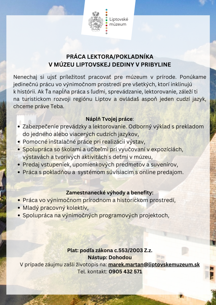 Inzerát Liptovského múzea - lektor/pokladník do Múzea liptovskej dediny v Pribyline.