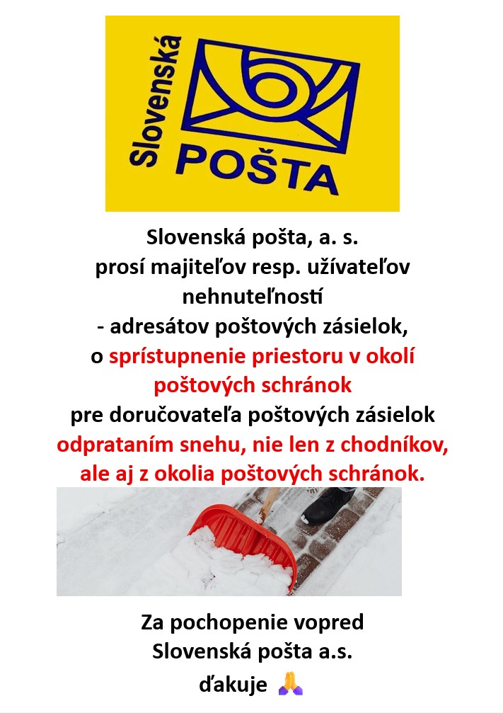 Slovenská pošta, a.s. prosí majiteľov resp. užívateľov nehnuteľností - adresátov poštových zásielok, o sprístupnenie priestoru v okolí poštových schránok pre doručovateľa poštových zásielok odprataním snehu, nie len z chodníkov, ale aj z okolia poštových schránok.